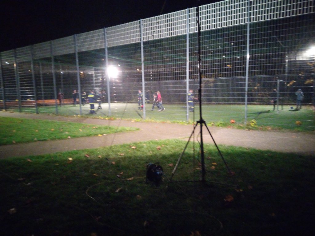 Hier war die Aufgabe, dass eingezäunte Spielfeld so auszuleuchten das hinterher Völkerball darauf gespielt werden konnte. Nachdem wir in zwei Trupps eingeteilt worden sind haben wie angefangen die Beleuchtung unter Aufsicht unserer Betreuer aufzubauen. Ziel war es die Stative und Leuchten so aufzustellen und auszurichten, dass wir Blendungsfrei in Ruhe spielen konnten. Nach einem kurzen heftigen Regenschauer, der uns zu einer Pause genötigt hat, konnten wir dann wenigstens mit dem spielen anfangen. Insgesamt konnten wir zwei Runden spielen, die mit einer Essenpause unterbrochen wurden.