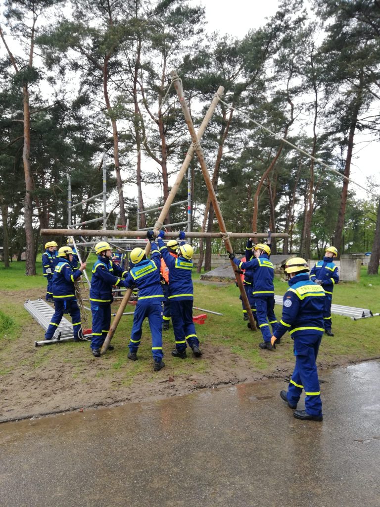 Nach einer intensiven ersten Übungseinheit gab es eine längere Pause, die für eine Nachbesprechung, ein stärkendes Frühstück und etwas Erholung genutzt wurde. Frisch gestärkt ging es weiter mit der Ausbildung am Trümmersteg. Hier mussten die Jugendlichen ihr Geschick beim Anfertigen von Bretttafelbunden und Kreuzbunden mit Rosette unter Beweis stellen sowie beim Aufbau eines Einsatz-Gerüst-Systems (EGS).