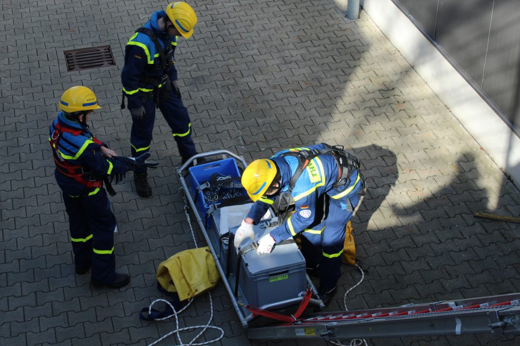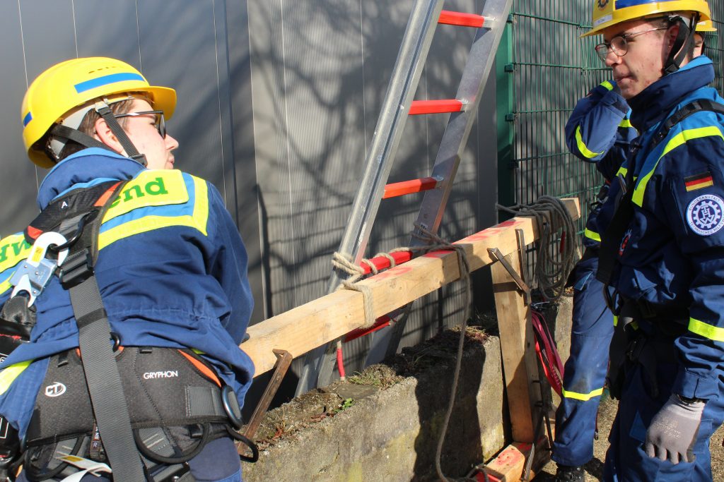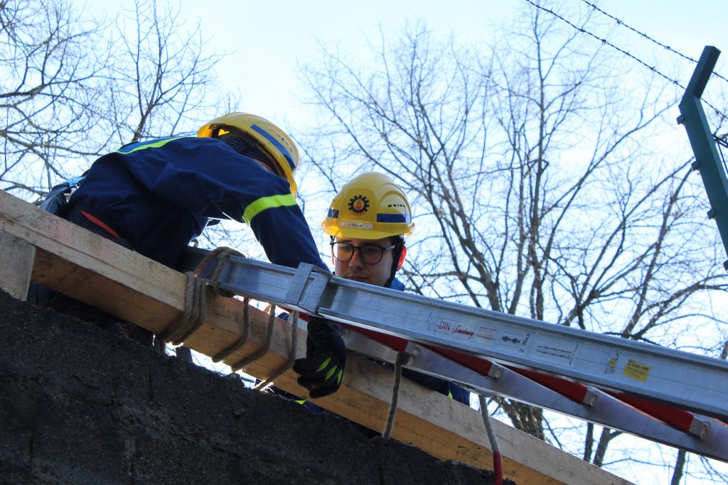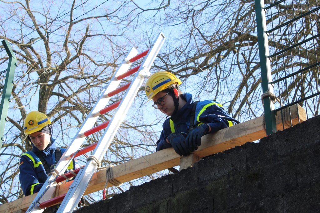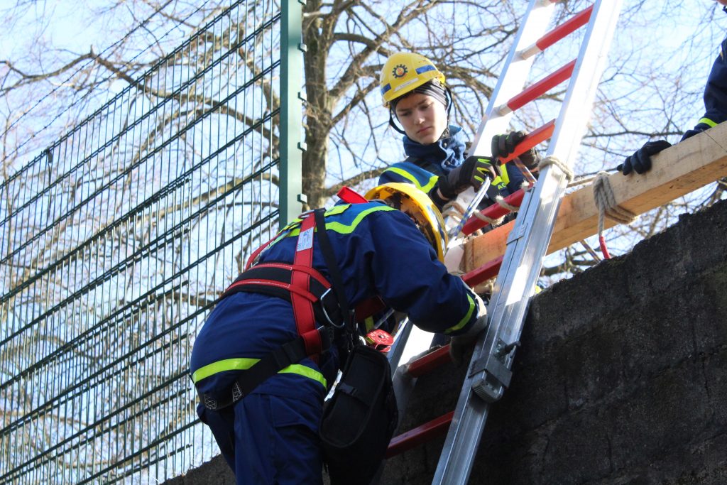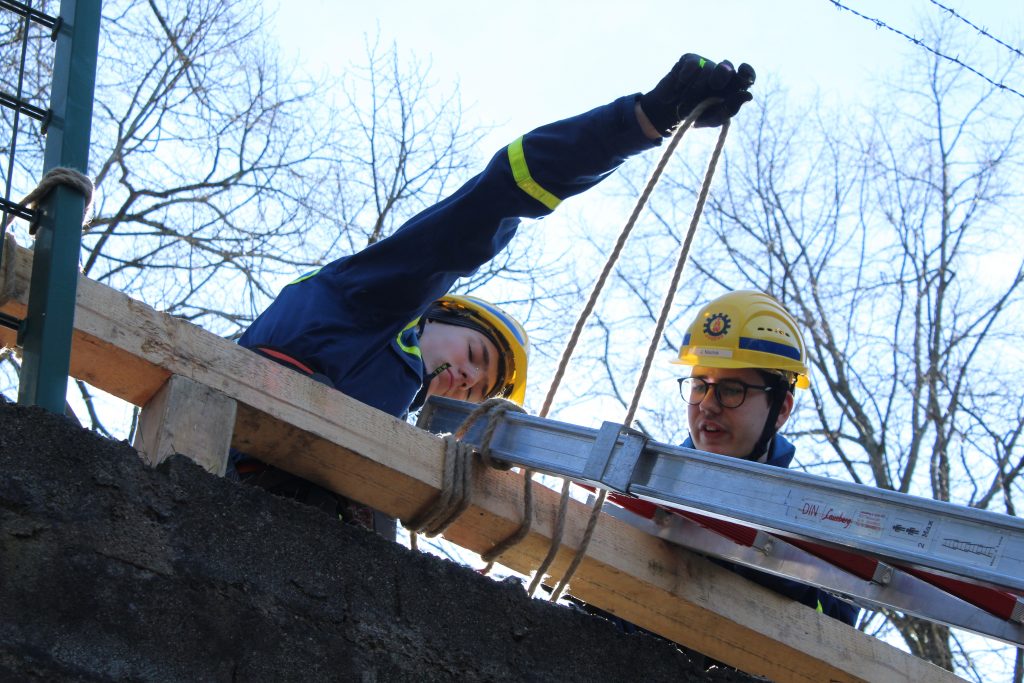 Um zu der Person zu gelangen, war es notwendig, einen Zaun abzubauen und eine Leiter hinunterzureichen. Dies erforderte nicht nur technisches Geschick, sondern auch Teamarbeit und strategisches Denken. Die angeforderten Materialien wurden anschließend geschickt durch die Schiefe Ebene nach unten befördert, was den Jugendlichen praktische Einblicke in den Materialtransport und die Herausforderungen einer echten Rettungsaktion ermöglichte.