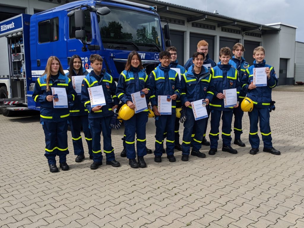 Die Jugend des Ortsverband Solingen machte sich in den frühen Morgenstunden auf den Weg nach Düsseldorf um dort das Leistungsabzeichen Bronze und Silber zu absolvieren. Nach einer kurzen Info zum Tagesgeschehen, begaben sich die Jugendlichen in die Theorieprüfung. Nach Beendigung der Theorieprüfung konnte die Jugend mit der Praxis der fünf Stationen starten. Darunter befand sich eine Gruppenaufgabe die gemeinsam als Team durchgeführt werden musste. Dabei konnten die Jugendlichen ihre Stärken und erlernten Fähigkeiten mit einbringen. Am frühen Nachmittag trafen sich alle Teilnehmenden Jugendlichen zusammen um die Uhrkunden zu empfangen.